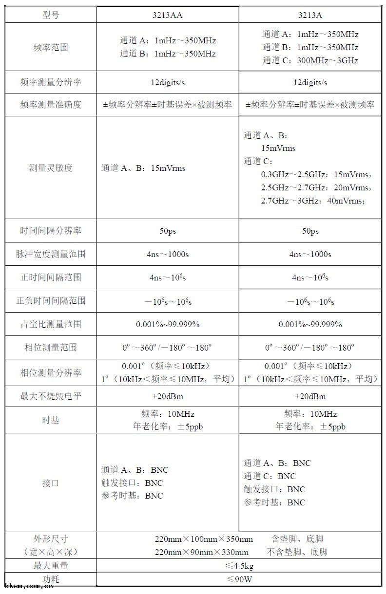 | 3213A | 頻率時間計(jì)數器(qì)/分析儀 | 通道A:1mHz~400MHz 通道B:1mHz~400MHz 通道C:100MHz~3GHz |