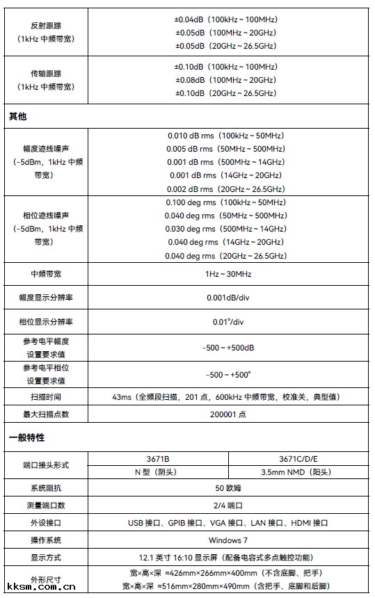 思儀3671系列矢量網絡分析儀產(chǎn)品(pǐn)包括3671B(100kHz~9GHz)、3671C(100kHz~14GHz) 、3671D(100kHz~20GHz)、3671E(100kHz~26.5GHz)、3671F(10MHz~40GHz) 、3671G(10MHz~43.5GHz) 。3671系列矢量網絡分析儀提供頻響、單端口(kǒu)、響應(yīng)隔離 、增強型響應(yīng)、全雙端口(kǒu)、電校准等多種校准方式,內設(shè)對數幅度、線性(xìng)幅度、駐波(bō)、相(xiàng)位、群時延 、Smith 圓圖、極坐標(biāo)等多種顯示格式,外(wài)配(pèi)USB、LAN、GPIB 、VGA、HDMI等多種標(biāo)准接(jiē)口(kǒu),能(néng)精(jīng)確測量微(wēi)波(bō)網絡的(de)幅頻特性(xìng)、相(xiàng)頻特性(xìng)和群時延特性(xìng)。3671 系列矢量網絡分析儀保留了矢量網絡分析儀的(de)特徵(zhēng) ,包括性(xìng)能(néng)指標(biāo) 、儀器外(wài)觀 、顯示效果、軟件界面方面,同時控(kòng)制(zhì)儀器的(de)體積(jī)、重量 、風噪,為用(yòng)戶營造良(liáng)好(hǎo)的(de)使用(yòng)體驗 。該產(chǎn)品(pǐn)可廣泛應(yīng)用(yòng)於微(wēi)波(bō)毫米波(bō)通信 、導航等領(lǐng)域,是工業生(shēng)產(chǎn)和高(gāo)校科(kē)研過程中的(de)測試設(shè)備。